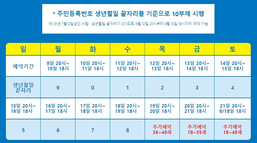 * 주민등록번호 생년월일 끝자리를 기준으로 10부제 시행예) 81년 7월12일생인 사람 : 생년월일 끝자리가 2이므로, 8월 12일 20시부터 8월 13일 18시까지 예약 가능