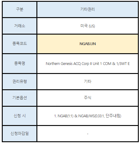 | 종목명 | Northern Genesis ACQ Corp II Unit 1 COM & 1/3WT E |