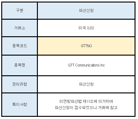 특이사항 | 미연방파산법 제11조에 의거하여 파산신청이 접수되었으니 거래에 참고 |