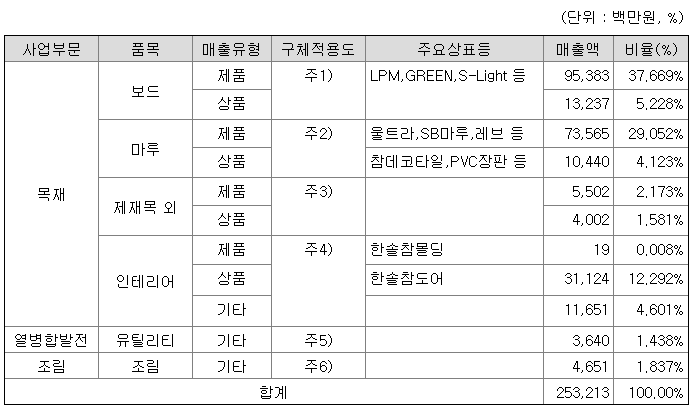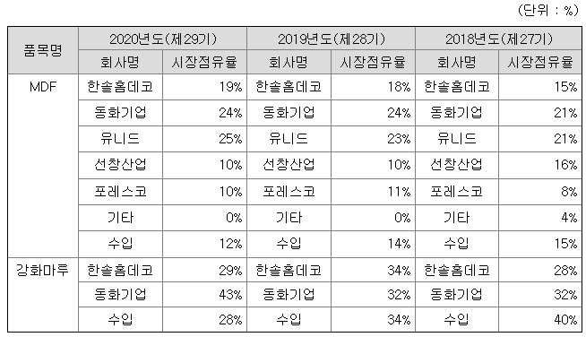 ○ 마루 바닥재는 원목마루, 합판마루, 강화마루로 구분되며 고급 바닥재에 대한 수요증가로 PVC바닥재를 대체하고 있습니다. PVC바닥재, 원목마루, 합판마루와 경쟁관계에 있으며 강화마루 시장에서는 국내 2개사와 수입품이 경쟁관계에 있습니다.