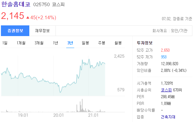 한솔홈데코의 주가는 2,145원이다. 코스피에 상장중이다.