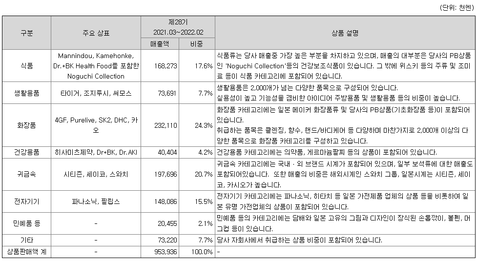 브랜드 상품(NB)과 자사 브랜드 상품(PB)으로 나누어 집니다. 브랜드 상품(NB)은 제조사의 판매가 지정 상품 이외에는 해당 매장의 판매 희망가격과 시장에서의 판매 가격을 고려하여 상품부장이 최종 판매가격을 결정하고 있으며, 자사 브랜드 상품(PB)은 시장 동향 및 경쟁사의 유사 상품 판매 가격을 고려하여 상품부장이 최종 판매가격을 결정하고 있는 바, 가격의 변동은 주요 매입처의 가격정책 또는 세금 변동에 따라 이루어집니다.