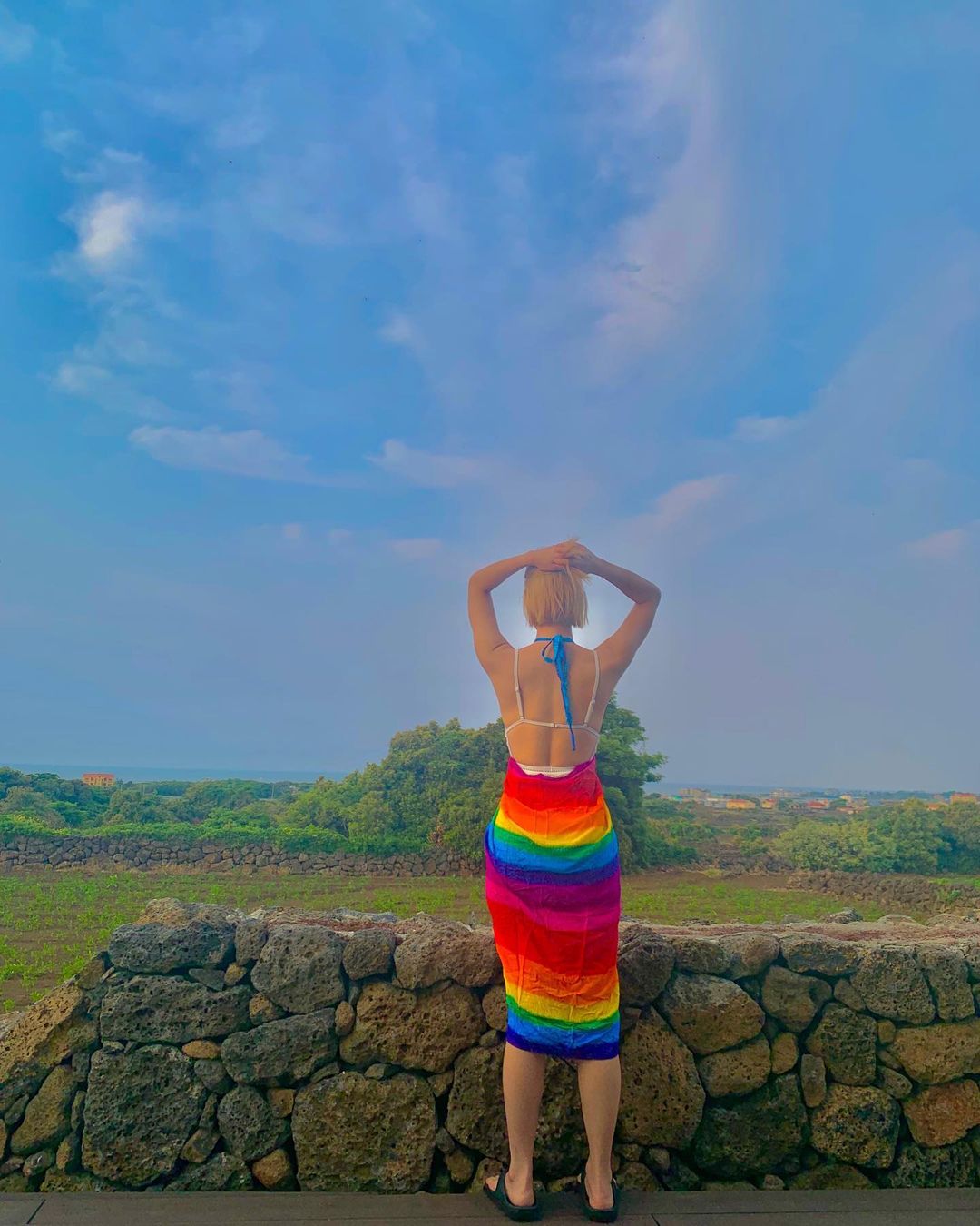 맹승지는 제주도 팬션 여행중 홍윤화가 사준 파격적인 비키니를 인스타에 공개하였다.