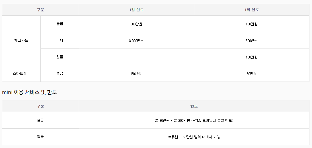 ※ 한도변경은 고객님이 직접 모바일앱을 통해 1일/1회 한도 내에서 설정 가능합니다. (단, mini는 한도변경 불가)
