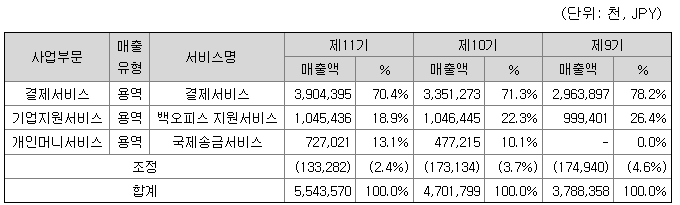 결제서비스 사업은 EC를 대상으로 한 결제솔루션과 팩토링을 중심으로 하는 파이낸셜 솔루션을 제공하고 있습니다. 기업지원서비스 사업은 회계서비스, 청구서 전자 발행ㆍ경비정산ㆍ워크플로우ㆍ근태관리 등의 백오피스 클라우드 솔루션, 계좌통합관리서비스 등 기업의 백오피스 지원 서비스를 제공하고 있으며, 개인머니서비스 사업은 한국에서 국제송금서비스를 제공하고 있습니다.