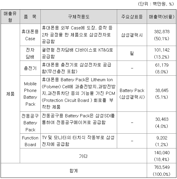 삼성전자 및 삼성SDI로의 매출이 전체의 78% 내외를 차지하며, 케이티앤지로의 매출액이 13%내외를 차지합니다. 제품별 매출액 및 매출비중은 다음과 같습니다.