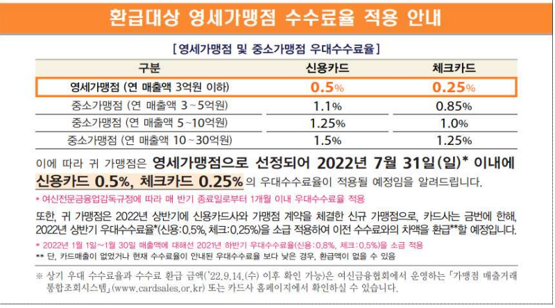 ㅇ 기납부한 카드수수료와 우대수수료*와의 차액을 환급해드릴 예정이며, 그 규모는 약 558억원(가맹점당 약 30만원) 정도로 추산됩니다.