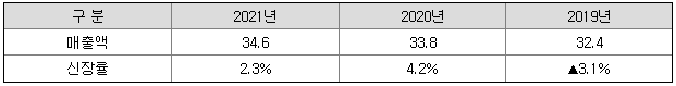 COVID-19에 따른 내식 수요 증가로 2021년 대형마트 매출액은 약 34.6조 원으로 전년 동기 대비 2.3% 증가하였으나, 채널간 경쟁 심화, 언택트 소비 확산 등의 영향으로 앞으로의 국내외 시장환경은 어려울 것으로 예상됩니다.