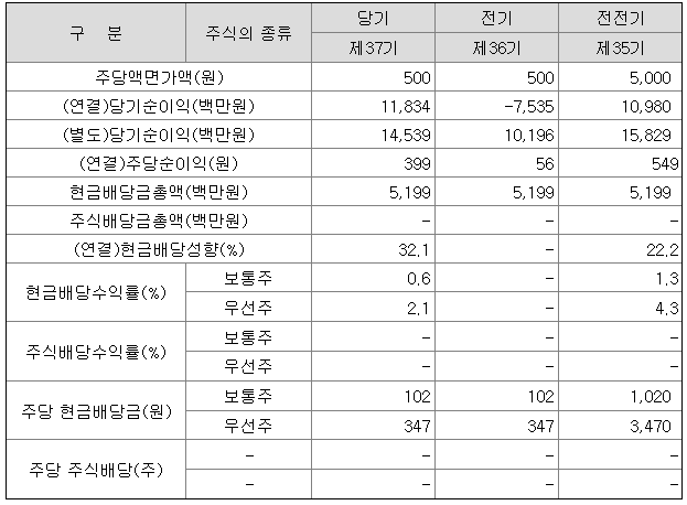 주2) 연속 배당횟수 및 평균 배당수익률은 2021년 3월 25일 제37기 정기주주총회에서 승인 된 주당 현금배당금 102원을 포함하여 산출하였습니다.