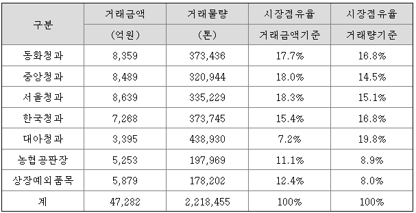 ※ 가락시장내 청과부류 지정도매법인 시장 점유율 (2021년 기준)