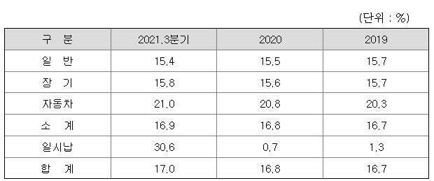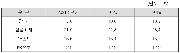 상기 표에서와 같이 2021년 3분기 손해보험업계는 67조 3,270억원의 원수보험료를 거수하여 전년 동기 대비 4.9% 성장하였습니다. 종목별로는 일반보험이 11.0%, 자동차보험이 3.8% 성장하였습니다. 매출의 약 2/3를 차지하는 장기보험시장은 계속보험료의 안정적인 유입에 따라 전년 대비 4.0% 증가하였습니다. 향후에도 국내 손해보험시장은 장기보험을 주도로 성장을 지속하겠지만, 시장의 높은 성숙도를 감안할 때 장기적으로 성장성 둔화가 불가피할 것으로 전망됩니다.