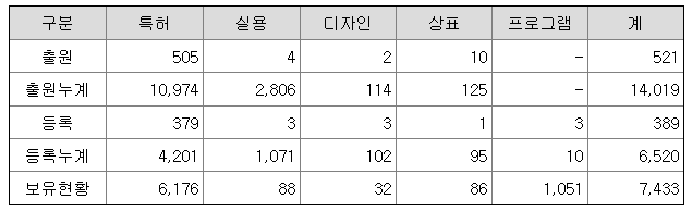영위하는 사업과 관련하여 7,433건의 지적재산권을 취득하여 보유하고 있으며, 각 지적재산권의 등록 및 보유현황은 다음과 같습니다.