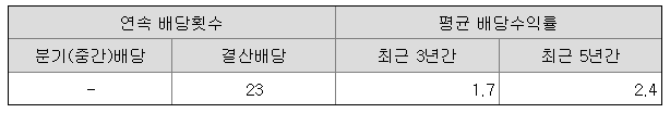 피제이전자는 23연속 배당을 해 오고 있으며, 평균 배당 수익률은 최근 3년간 1.7%이다.
