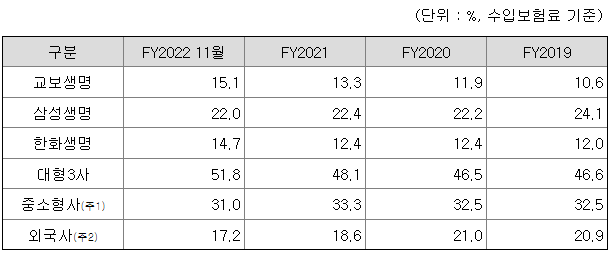 국내 생명보험시장은 총 23개사가 사업을 영위하고 있으며, 2022년 11월 기준 대형3사(삼성, 교보, 한화)의 시장점유율은 약 51.8%입니다. 중소형사와 외국사를 포함한 시장점유율은 다음과 같습니다.